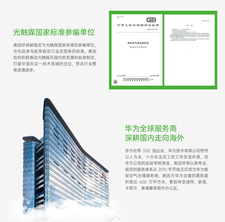 奧因光觸媒——裝修污染治理中的核心產(chǎn)品,國家863重點科技項目成果;擁有多項自主發(fā)明專利,噴涂在墻面、天花、家具表面、地毯等處,對甲醛、苯、氨、TVOC等有害氣體進(jìn)行長效治理。